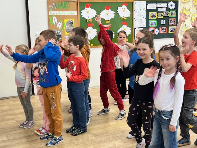 Nejprve každá třída zazpívala písničku v rodném jazyce, pak společně anglickou a na závěr jsme si zatančili.