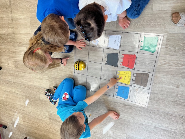 Zařadili jsme aktivitu, kde děti sluchem rozeznávaly hlasy zvířátek, anglicky je pojmenovaly a naprogramovaly cestu k obrázku. Práce s včelkami Bee Bot se jim moc líbila. foto